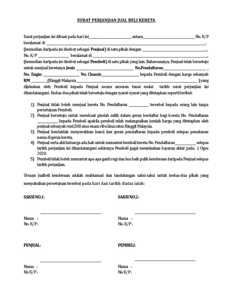 Kami berhak menuntut bayaran tambahan jika kenderaan ini lewat dikembalikan. Contoh perjanjian jual beli kenderaan. Contoh surat perjanjian jual beli kereta pdf.
